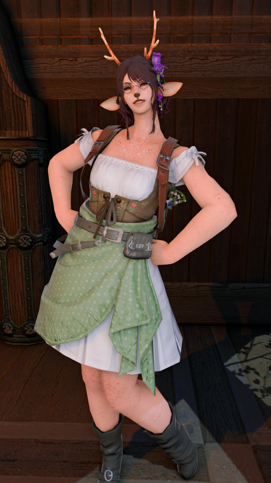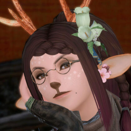Penelope Fields is a young Elezen, though not your typical one! Sporting a cervid-like face (complete with a set of small antlers) and a fluffy tail, they look more like a forest spirit than your average elf -- they clearly put the "Wild" in Wildwood! Indeed, they seem a bit more feral than their compatriots, preferring to live out in the woods, and spending more time talking with animals and Sylphs than people.
